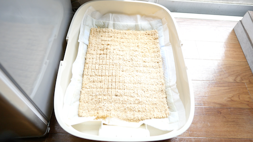 おしっこを吸収して「おがくず」へと変貌した猫砂がスノコの下にあるトレーに落ちているんです。