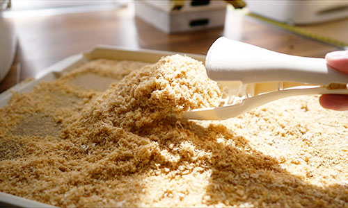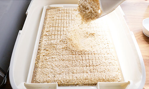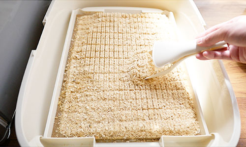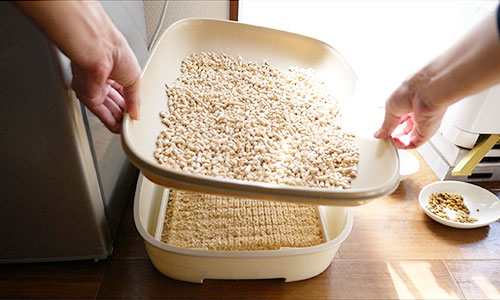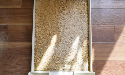 『う◯こさん』を取り除き、残りの猫砂をかき混ぜ、おが屑となった部分をすのこの下に落とします。(水分を含んだペレットは柔らかいのでおが屑となって簡単に下のトレーに落ちていきます)
