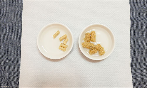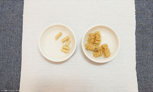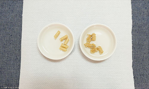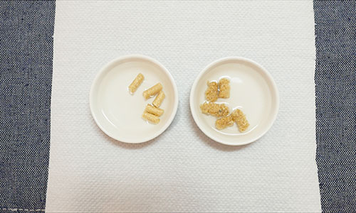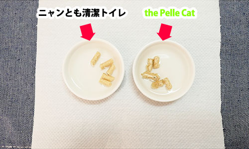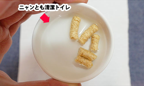 まずはおしっこと想定して、お水につけて実験です( ´ ▽ ` )ノ 右側のお皿に注目!
